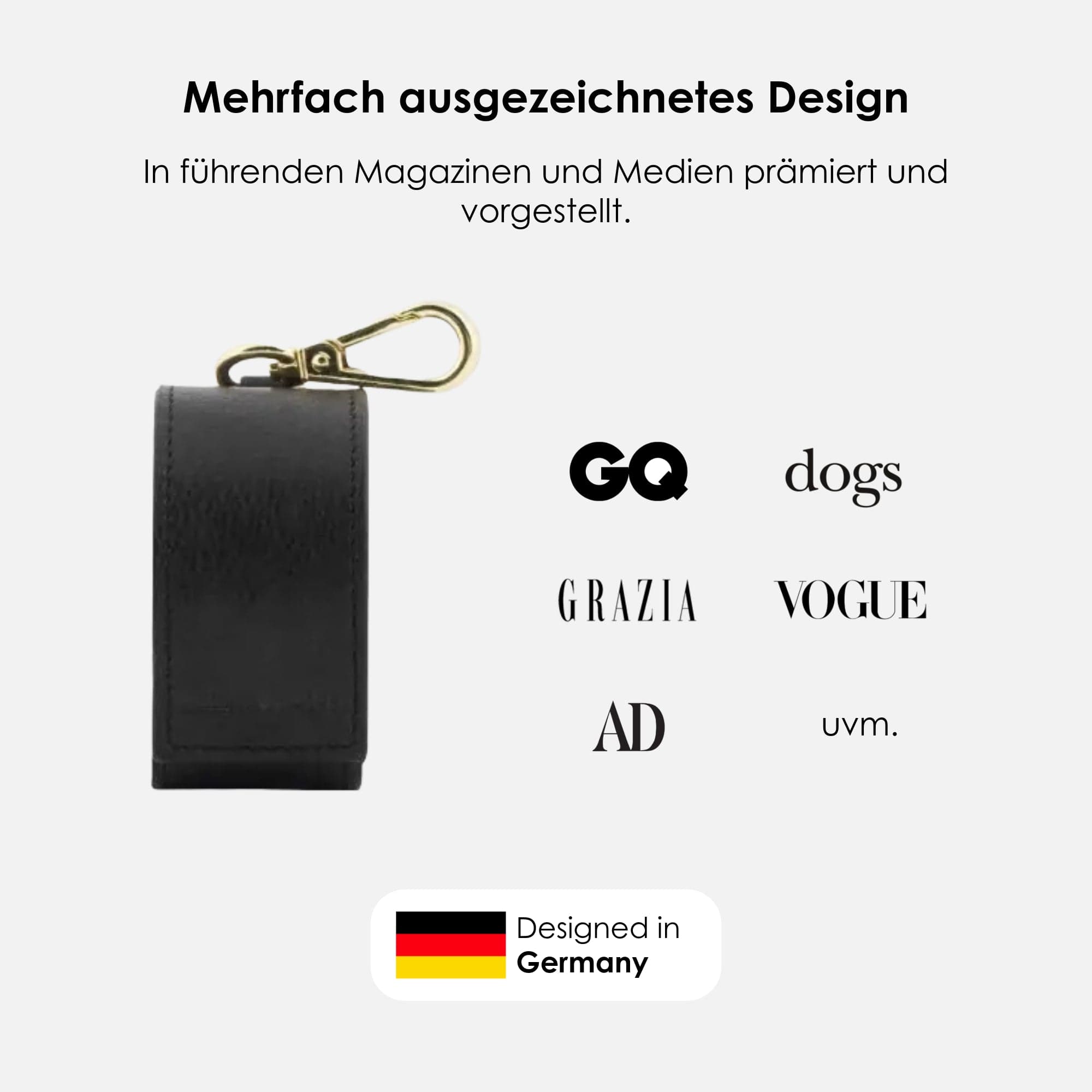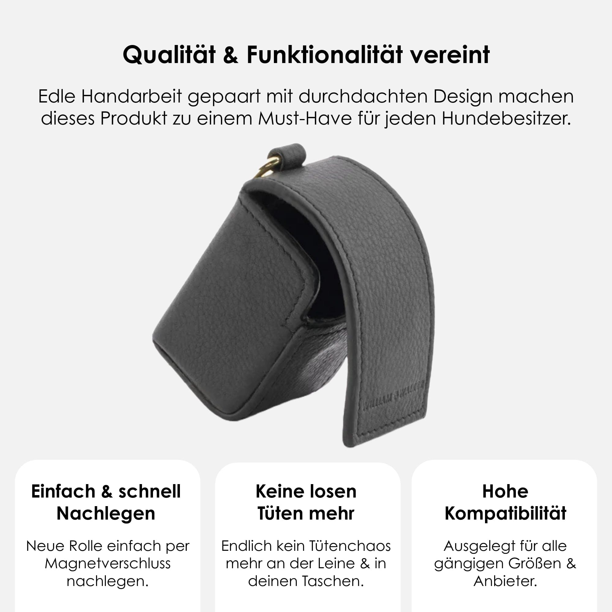 Distributeur de sacs à crottes de haute qualité en cuir noir avec ouverture pour le retirer à l'arrière. Facile à attacher grâce au mousqueton.