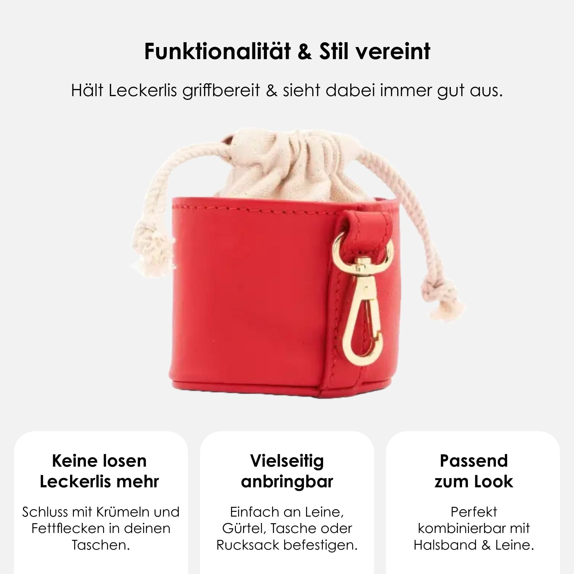Sac à friandises de haute qualité en cuir rouge avec des possibilités de fixation pratiques pour un dressage de chien stylé.