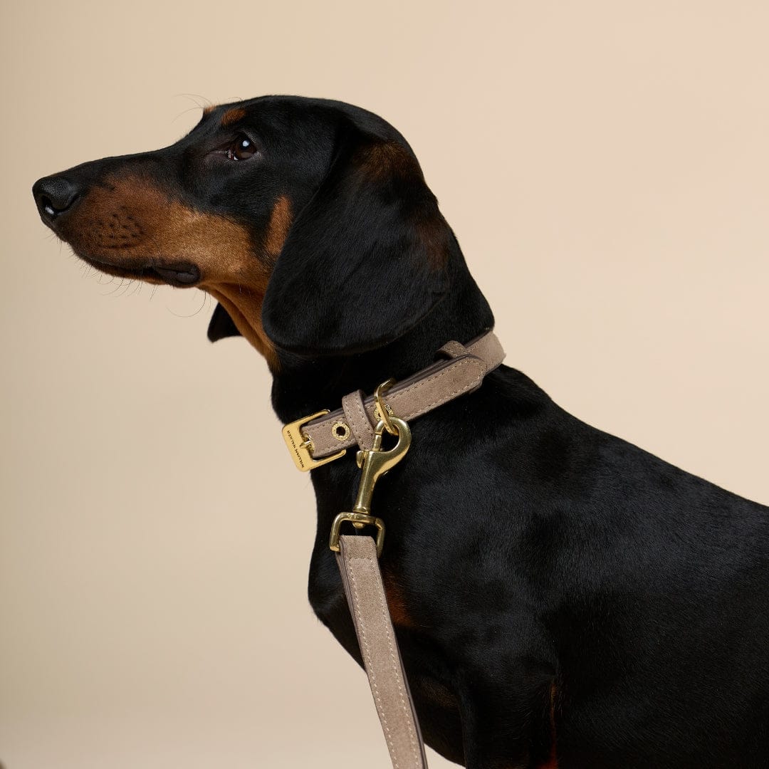 In aufwendiger Handarbeit gefertigte Wildleder-Hundeleine in dezentem grau-beige mit goldenen Messingbeschlägen. Erhältlich in zwei Ausführungen und zwei Größen für kleine und große Hunde.